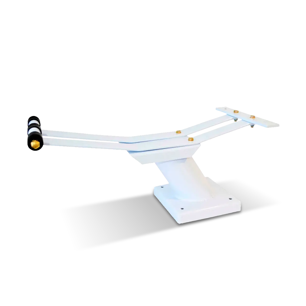 Base soporte Vulcano para plataforma de salto de 250 cm. Fabricada en acero elástico de espesor 3/16" y terminación blanco mate. Provista de rodillos de goma que ayudan al deslizamiento y correcta flexibilidad de la plataforma.
