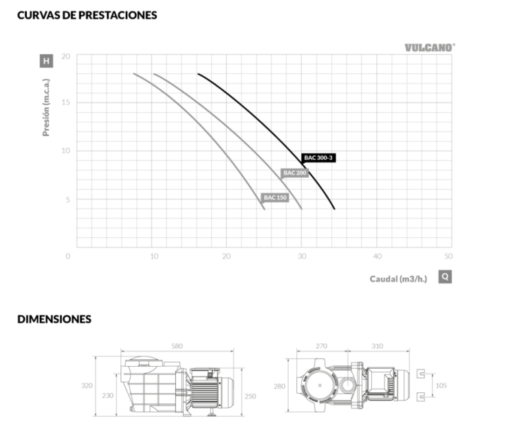 Bomba autocebante para piscina BAC 300 Vulcano. Diseñada especialmente para proyectos de gran envergadura. Su performance permite mover grandes volúmenes de agua en natatorios públicos y privados, y su diseño reforzado responde a las más altas exigencias.