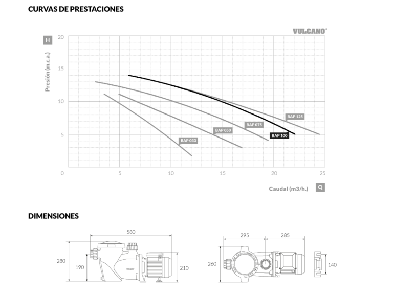 Bomba autocebante para piscina BAP 100 Vulcano. Ofrece un óptimo rendimiento para responder a las exigencias del uso profesional. Es utilizada para la recirculación de grandes caudales de agua principalmente en grandes piscinas.