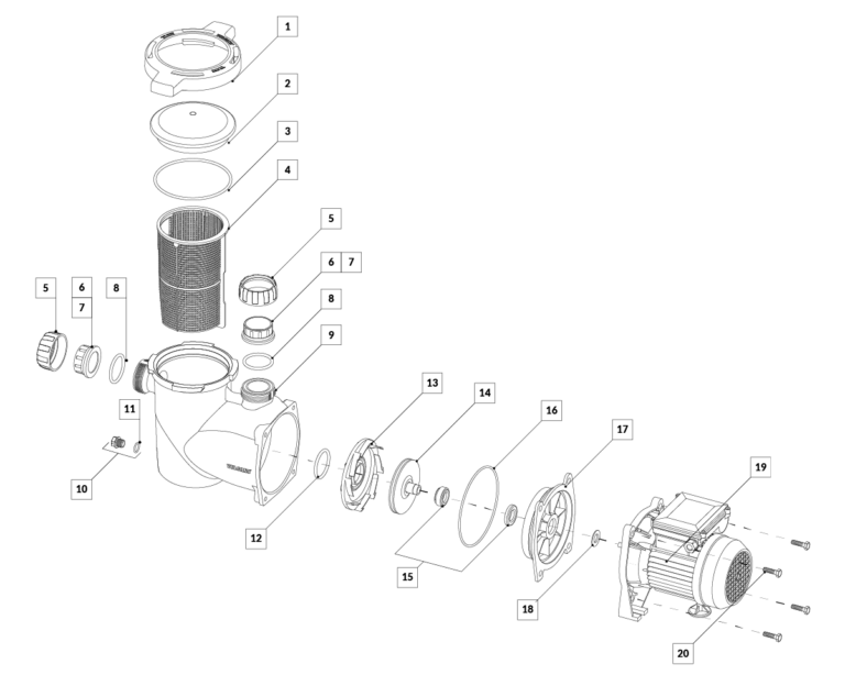 Cuenta con pre-filtro incorporado y canasto atrapa hojas de gran tamaño, tapa tipo mariposa de rápida apertura con un ¼ de giro y uniones dobles incorporadas. Provista con bujes para roscar de 1 ½” y de ø50 mm para pegar caños de PVC, para adaptarse a la cañería de la instalación.