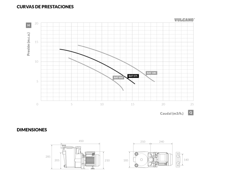 Bomba autocebante para piscina BAT 075 Vulcano. Diseño tradicional. Cuenta con un canasto atrapa hojas amplio y sistema de tapa tipo mariposa de rápida apertura con un ¼ de giro.