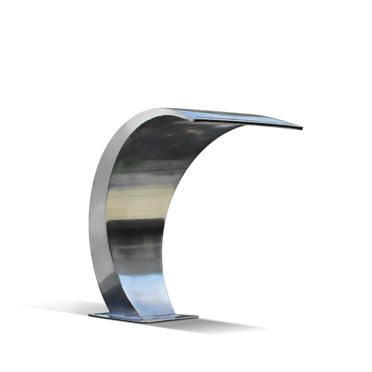 Cascada volumétrica Vulcano. Fabricada de acero inoxidable, pensada para ser colocada en la vereda con una altura de 46 cm. Genera una lámina de agua vistosa y continua de 35 cm de ancho hasta el espejo de agua. Su terminación pulido brillante destaca y ofrece un distintivo ornamental para su piscina.