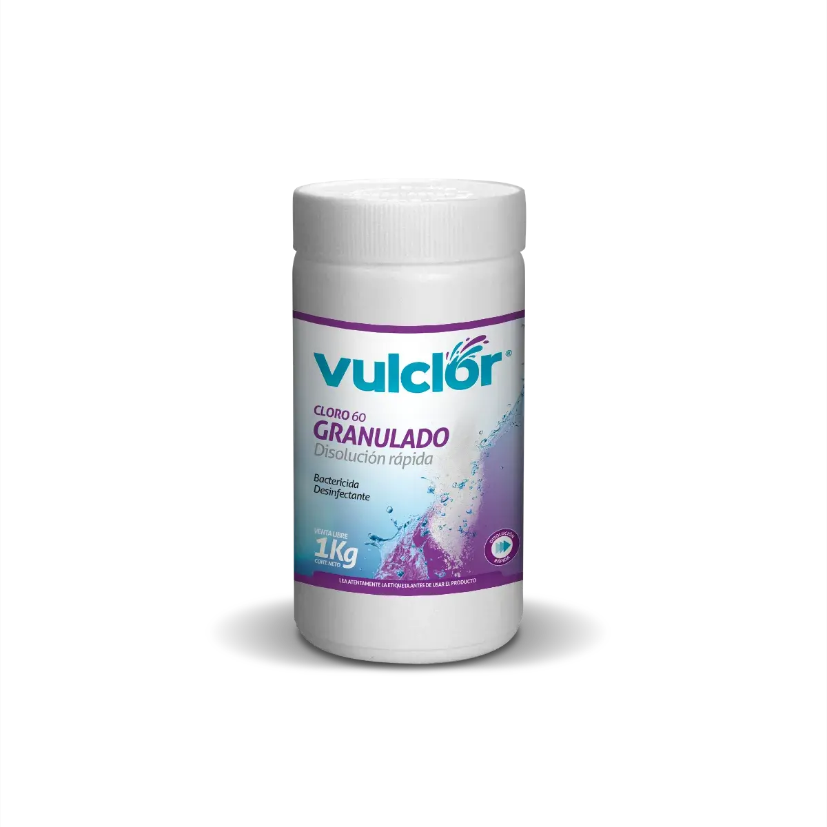Cloro granulado Vulcano - Disolución rápida 1 kg. Eficaz bactericida de disolución rápida con alto poder desinfectante, ideal para piscinas de fibra de vidrio o pintadas. No incrementa la alcalinidad del agua, se mantiene estable ante la acción del sol y es de alto poder residual.