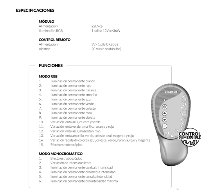 Controlador Vulcano 36W Plus (220V) para luminaria subacuática RGB. Desarrollado para realizar el control de la iluminación RGB de la piscina a través de control remoto (incluido).