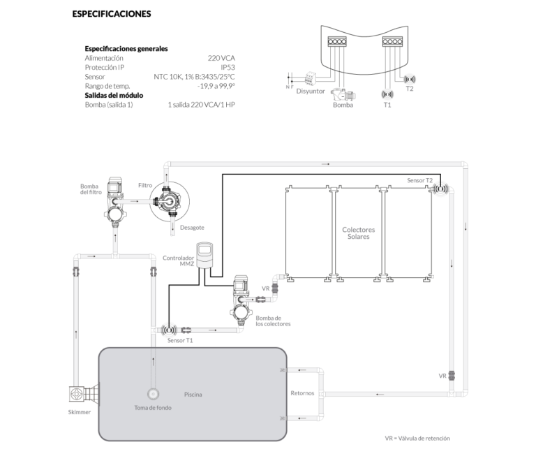 Controlador Solar Vulcano. Automatiza el calentamiento de la piscina actuando con 2 sensores (incluidos) y disponiendo de funciones de anti congelamiento y sobrecalentamiento.