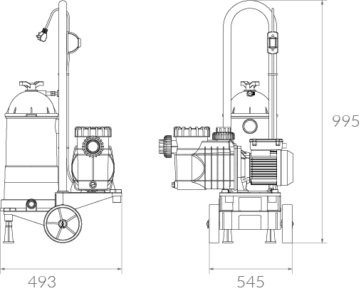 Equipo móvil para filtrado de piletas de hasta 50 m³, compuesto por: Carro porta bomba y filtro, Tanque ABS, Cartucho filtrante ø170 mm, Bomba BAE 0.50HP monofásica para piscina-2, Manguera flotante 1 1/4" x 6 m (aspiración), Manguera flotante 1" x 6 m (retorno), Limpiafondo medialuna liviano, mango telescópico de 3,6 m y Kit analizador de cloro y PH.
