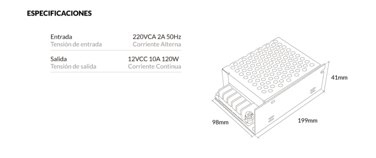 Fuente Switching Vulcano 12V 10A (120W) para alimentar luminarias LED. Permite transformar la energía eléctrica que alimenta al sistema, reduciendo la tensión y rectificando el voltaje de corriente alterna (VCA) a corriente continua (VCC).