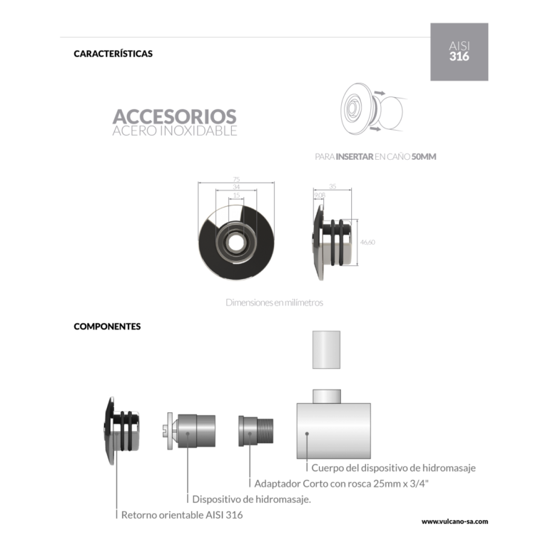 Hidromasajeador de acero inoxidable AISI 316, para insertar en caño de PVC ø50 mm (Clase 6). El hidromasajeador proporciona un chorro de agua direccionable con burbujas de aire que masajea el cuerpo del bañista, permitiendo configura un sector de SPA dentro de la pileta. Su terminación en acero inoxidable pulido otorga una terminación diferencial en piscinas de hormigón El conjunto se compone de un retorno orientable construido en acero inoxidable macizo más un conjunto hidráulico que permite la mezcla aire-agua. Para mas información ver el manual del producto.