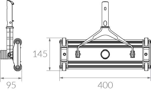 Limpiafondo de aluminio 35cm Vulcano. Dispositivo para aspirar suciedad y residuos depositados en el fondo de la piscina. Para utilizarlo, se debe conectar la manguera flotante al acople de aspiración y un mango fijo o telescópico.