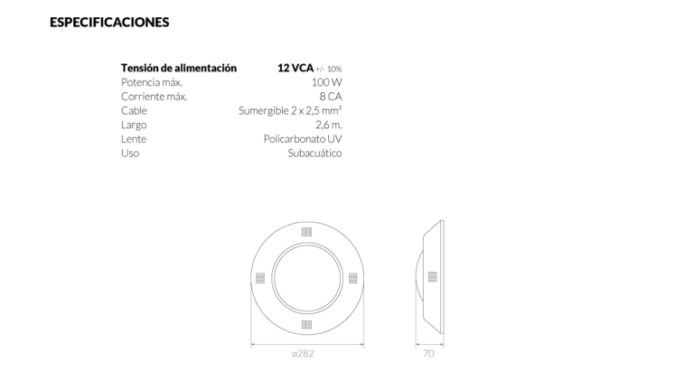 Luminaria Bipin subacuática Vulcano para adosar en hormigón y fibra de vidrio. Posee cuerpo de plástico ABS, lente de policarbonato rugoso, lámpara halógena BiPin de 100W que opera con tensión de 12V. Incluye pasamuro para adosar en hormigón.