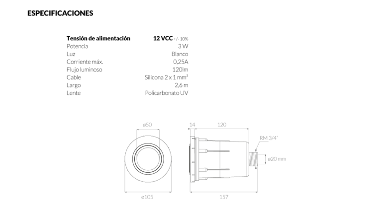 Luminaria Spot subacuática Vulcano con aro blanco para embutir en fibra de vidrio. Posee placa de 12 LEDs luz blanca de 3W que opera con tensión de 12 V.