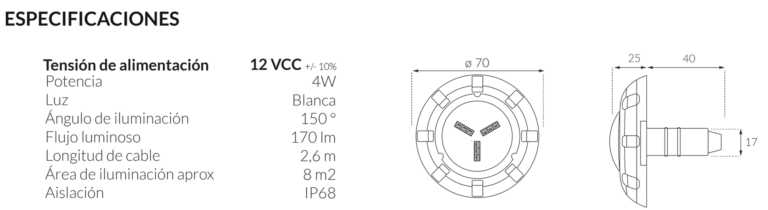 Luminaria subacuática LUMIPOOL Vulcano 4W de luz blanca 12 VCC. Desarrollada con lo último en tecnología, brinda excelente potencia de iluminación con niveles muy bajos de consumo energético. Esta luz, fabricada completamente en policarbonato led, es compacta y de fácil instalación.
