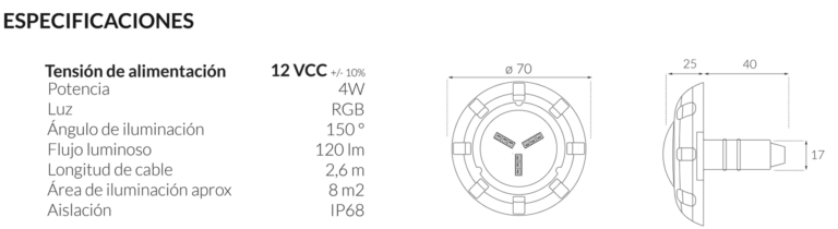 Luminaria subacuática LUMIPOOL Vulcano 4W de luz RGB 12 VCC. Desarrollada con lo último en tecnología, brinda excelente potencia de iluminación con niveles muy bajos de consumo energético. Esta luz, fabricada completamente en policarbonato led, es compacta y de fácil instalación.