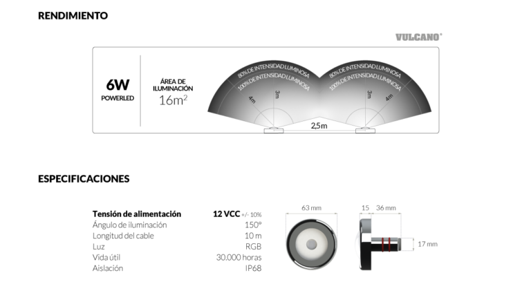 Luminaria subacuática PowerLED Vulcano 6W de luz RGB 12 VCC con cable de 10 m. Con ángulo de apertura de 150°, brinda excelente potencia de iluminación con niveles muy bajos de consumo energético.