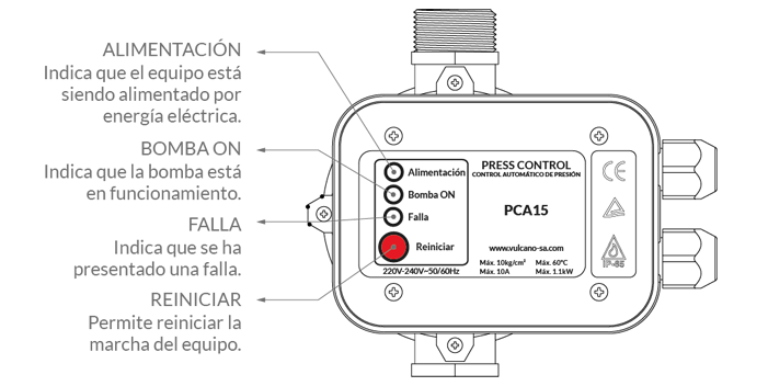 Press control Vulcano. Diseñado para controlar automáticamente el funcionamiento de la bomba, siendo la solución ideal para aumentar la presión de las tuberías en instalaciones. Su función principal es mantener el sistema doméstico de suministro de agua en el estado de funcionamiento a presión constante.