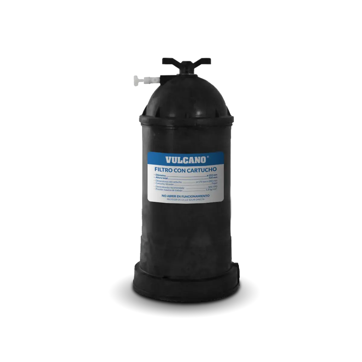 Filtro Vulcano con cartucho. Fabricado de plástico ABS, posee cartucho filtrante de ø170 mm para retener impurezas menores a 20 micras y permite ser retirado para su limpieza. De tamaño compacto y peso liviano, ideal para ser trasladado.