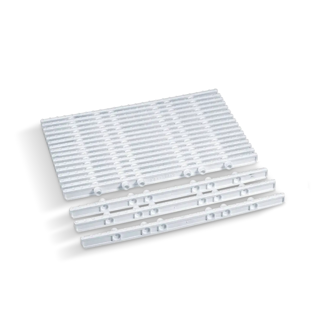 Varilla plástica larga Vulcano. Fabricada de polipropileno con elastómero de primera calidad, con un tamaño de 50 cm. de largo; su ensamblado modular permite el desarrollo de una línea de rejillas que destaca por ser antideslizante y agradable a la pisada. Su principal característica radica en la flexibilidad de montaje y diversidad de uso.